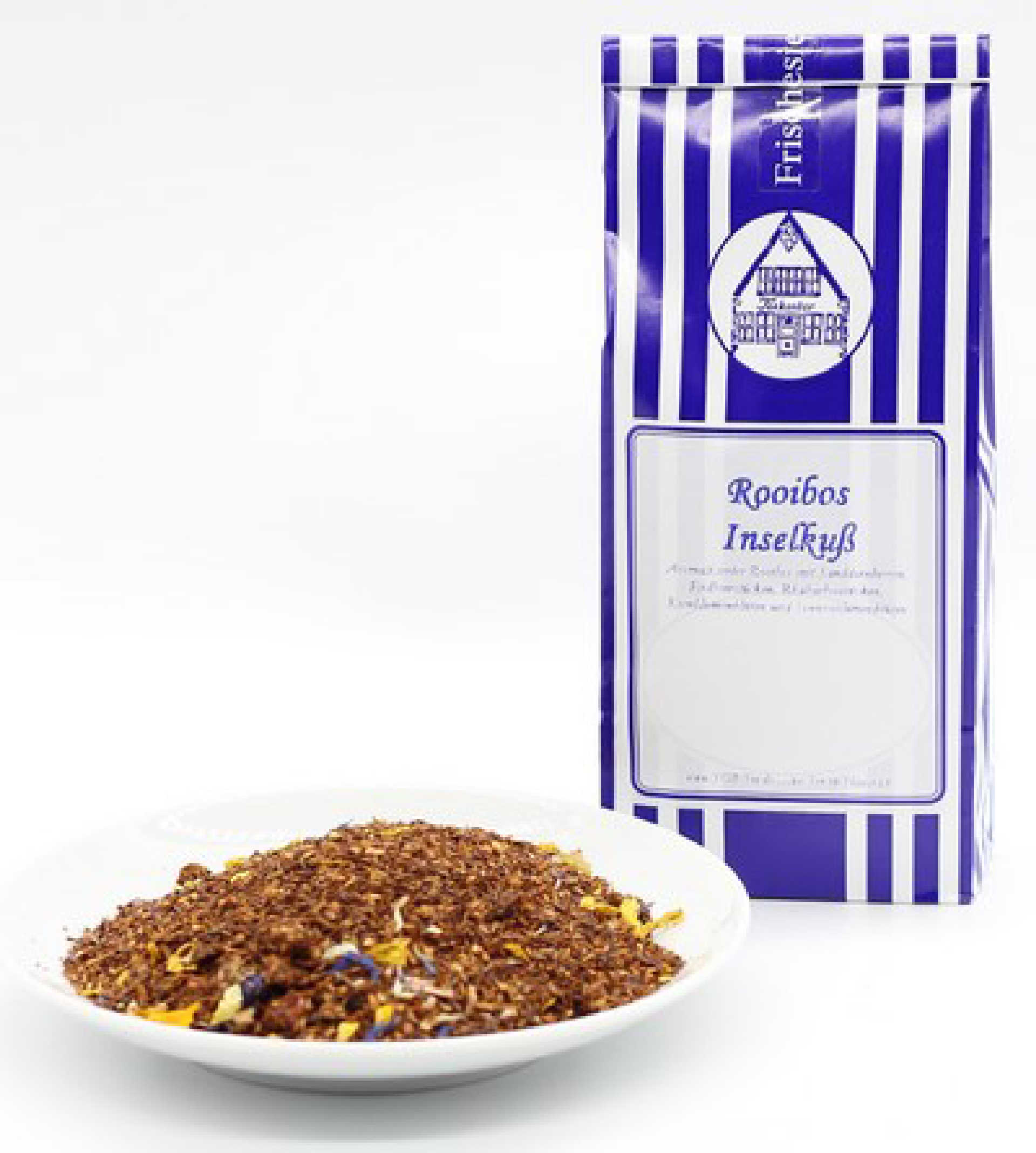 Aromatisierter Rooibos mit Sanddornbeeren, Erdbeerstücken, Rhabarberstücken, Kornblumenblüten und Sonnenblumenblüten