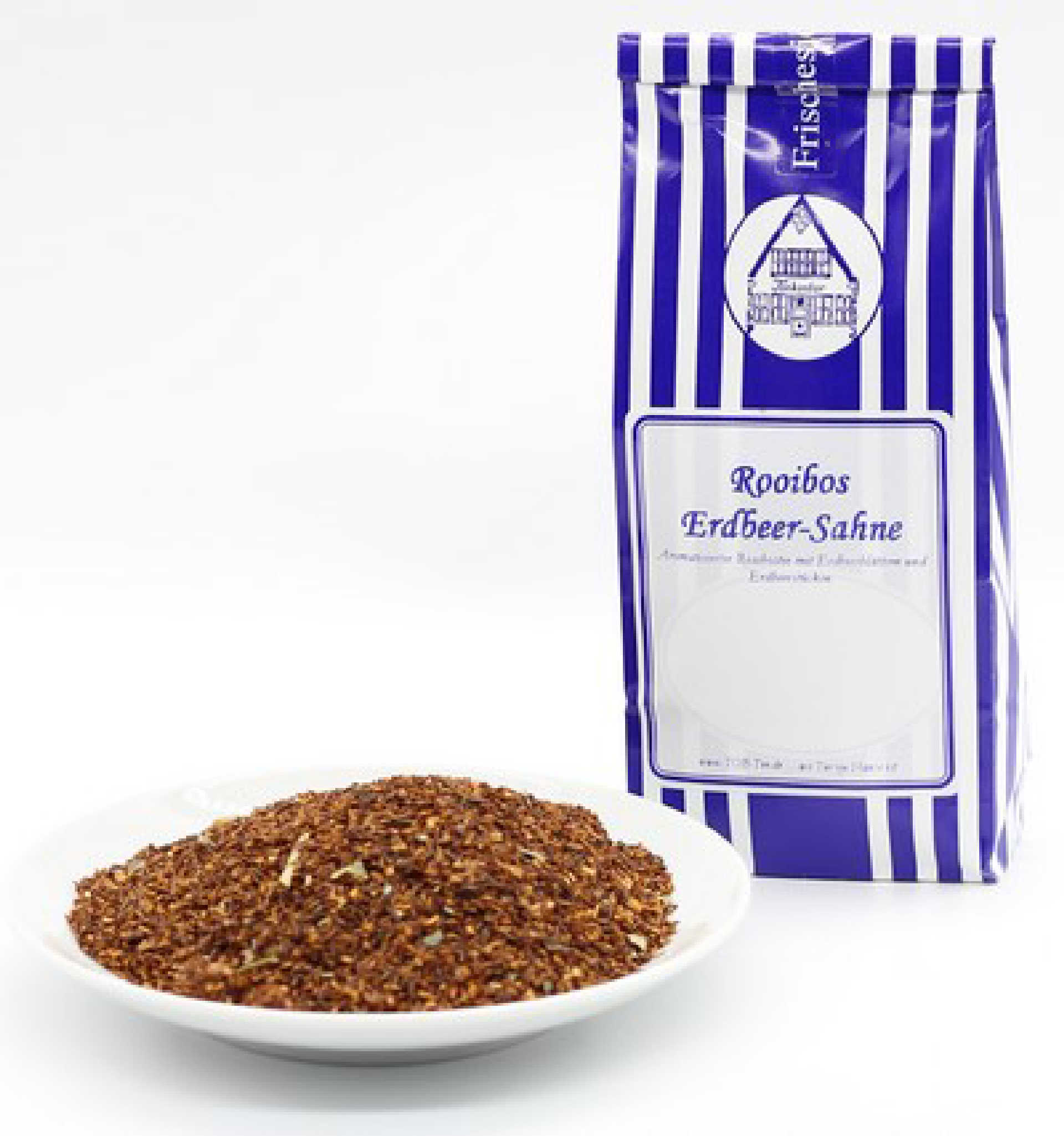 Aromatisierter Rooibostee mit Erdbeerblättern und Erdbeerstücken und lieblichem Sahnearoma