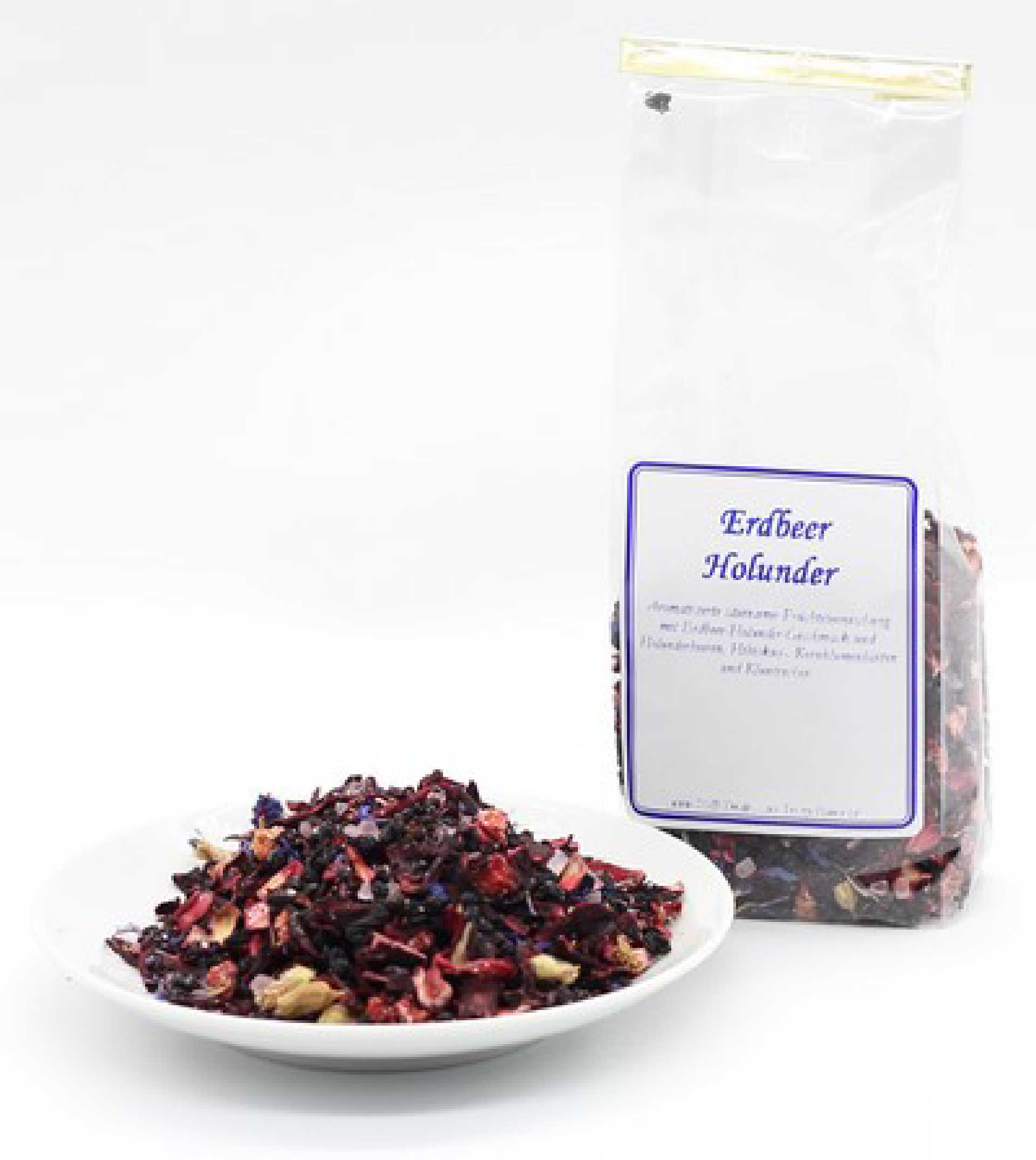 Früchtetee mit Erdbeeren und Holunder – süß, blumig und leicht.