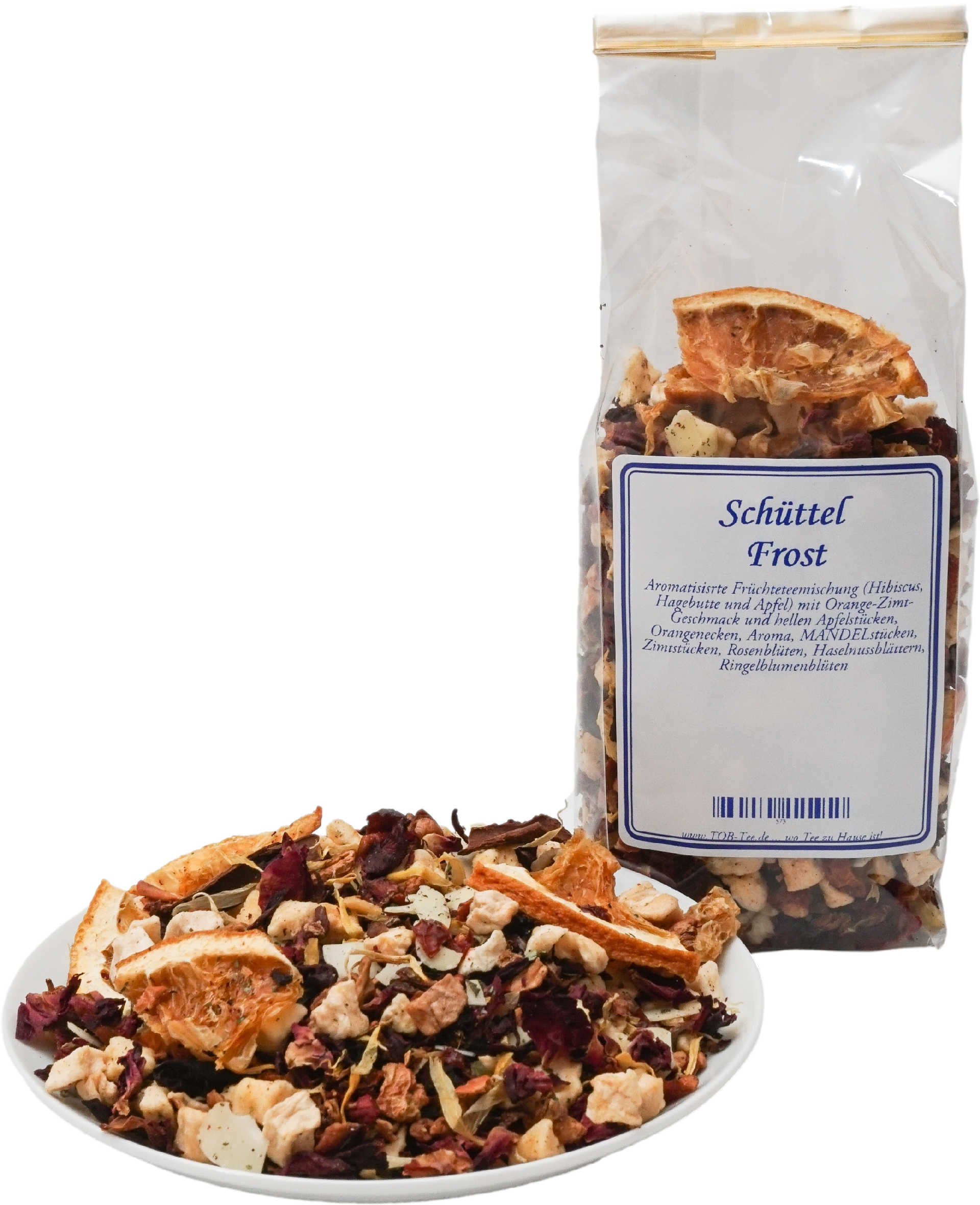 Aromatisisrte Früchteteemischung (Hibiscus, Hagebutte und Apfel) mit Orange-Zimt-Geschmack und hellen Apfelstücken, Orangenecken, Aroma, MANDELstücken, Zimtstücken, Rosenblüten, Haselnussblättern, Ringelblumenblüten