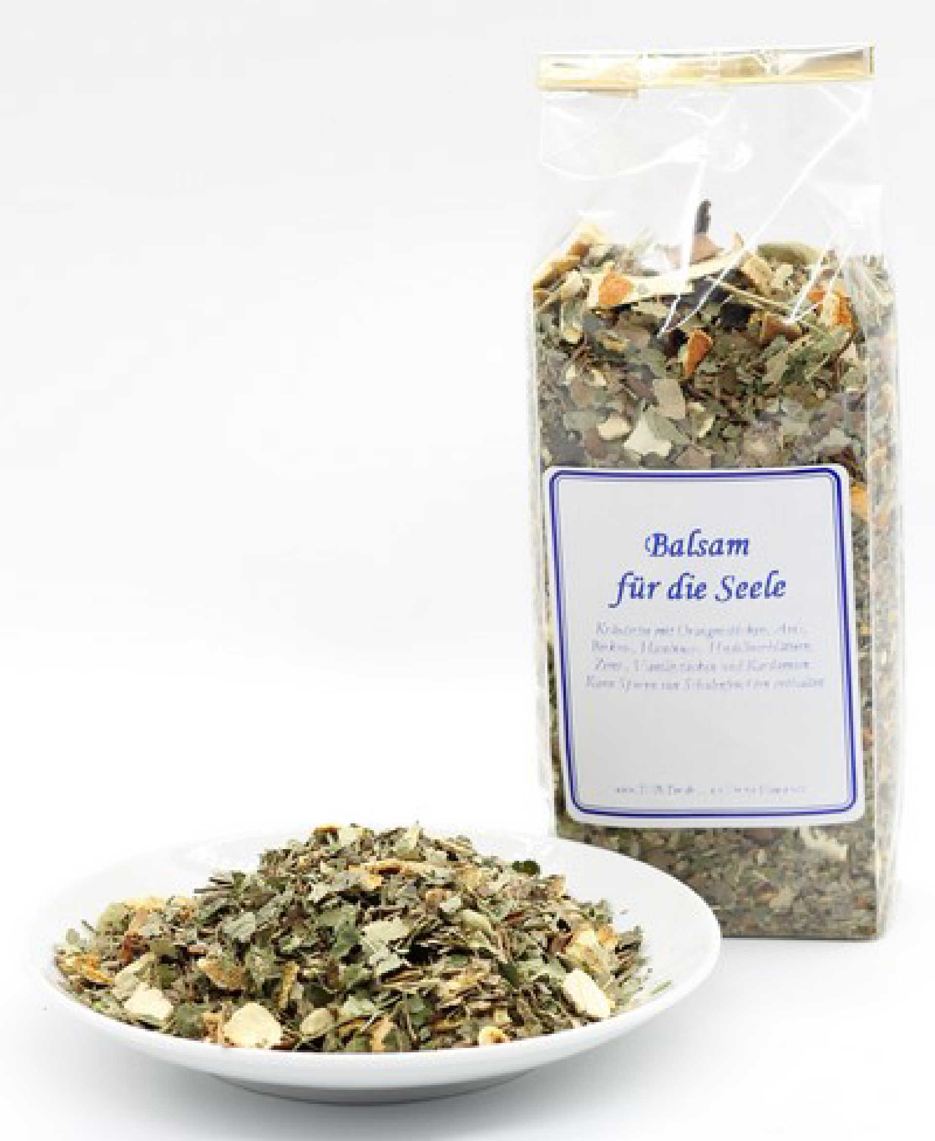 Kräutertee mit Orangenstücken, Anis, Birken-, Haselnuss-, Heidelbeerblättern, Zimt-, Vanillestücken und Kardamom. Kann Spuren von Schalenfrüchten enthalten