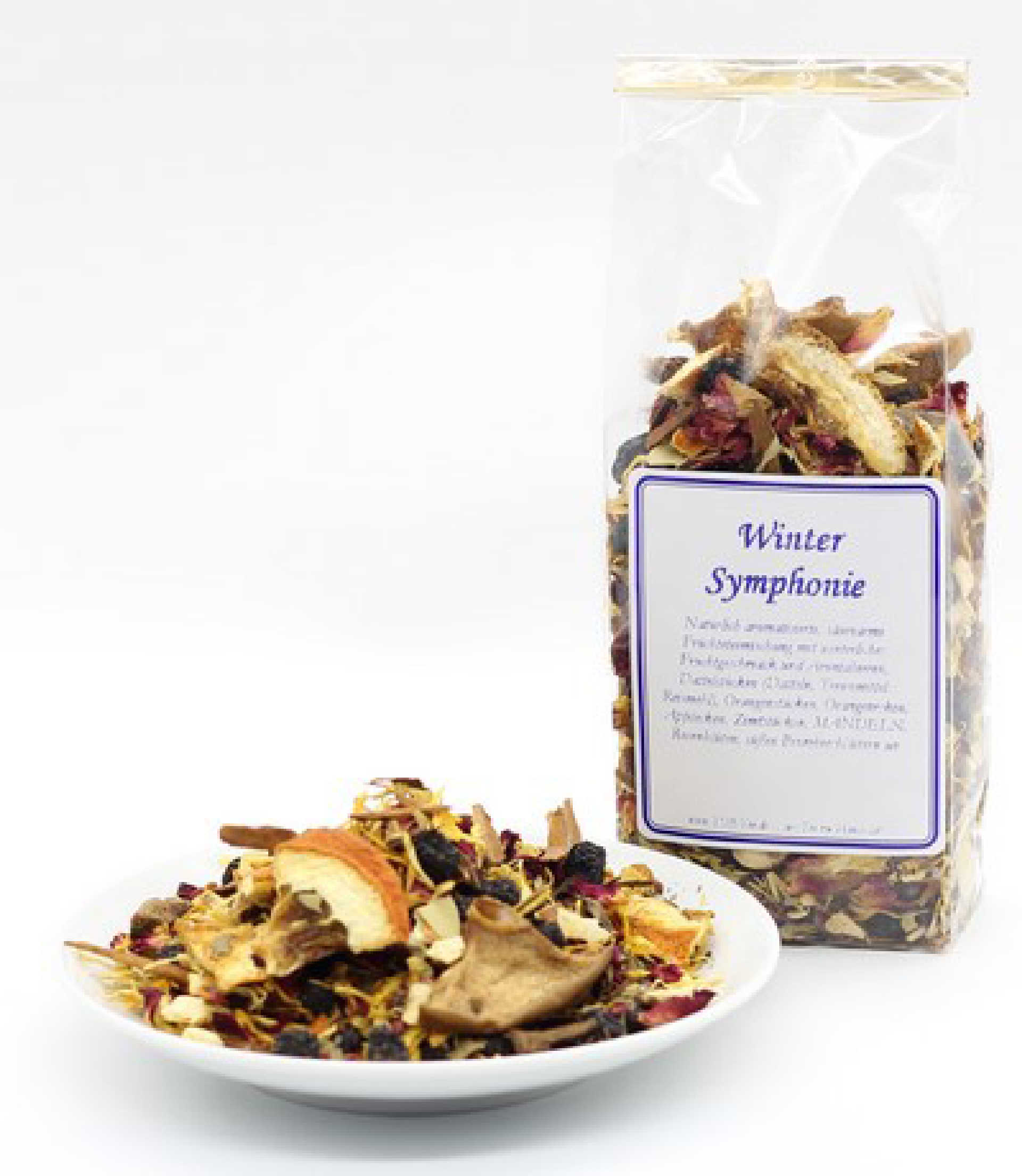 Natürlich aromatisierte, säurearme Früchteteemischung mit winterlicher Fruchtgeschmack und Aroniabeeren, Dattelstücken (Datteln, Trennmittel: Reismehl), Orangenstücken, Orangenecken, Apfelecken, Zimtstücken, MANDELN, Rosenblüten, süßen Brombeerblättern und Ringelblumenblüten, enthält BITTERMANDELöl