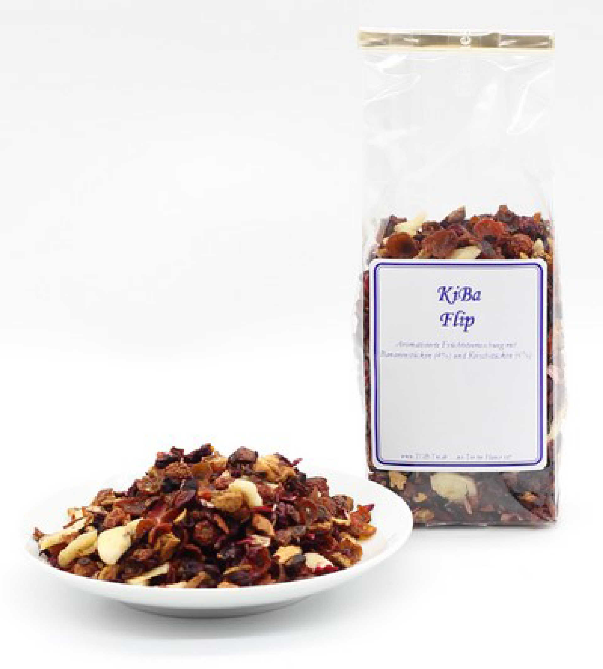 Aromatisierte Früchteteemischung (Hibiscus, Hagebutte und Apfel) mit Bananenstücken (4%) und Kirschstücken (4%)