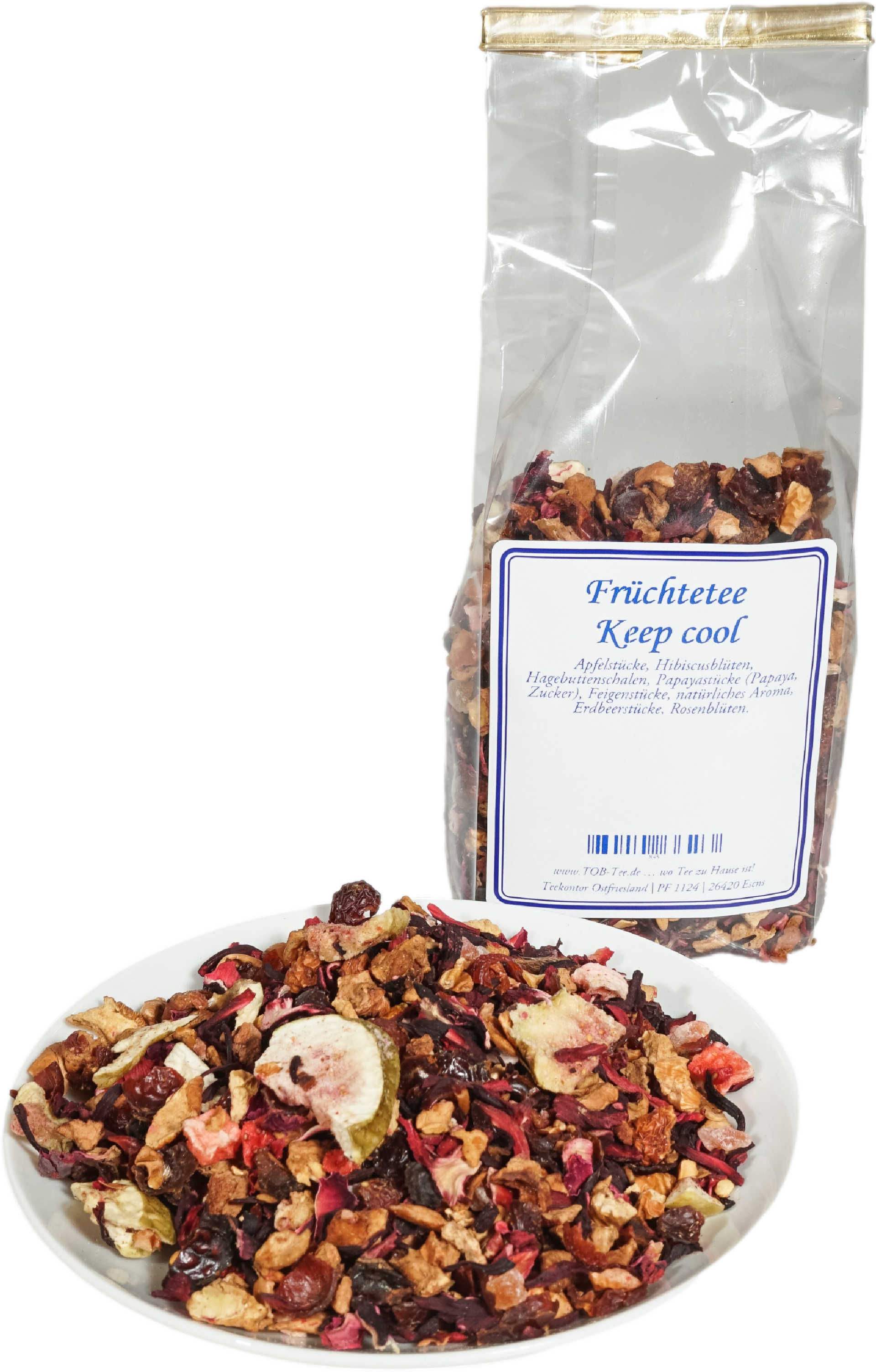 Apfelstücke, Hibiscusblüten, Hagebuttenschalen, Papayastücke (Papaya, Zucker), Feigenstücke, natürliches Aroma, Erdbeerstücke, Rosenblüten.