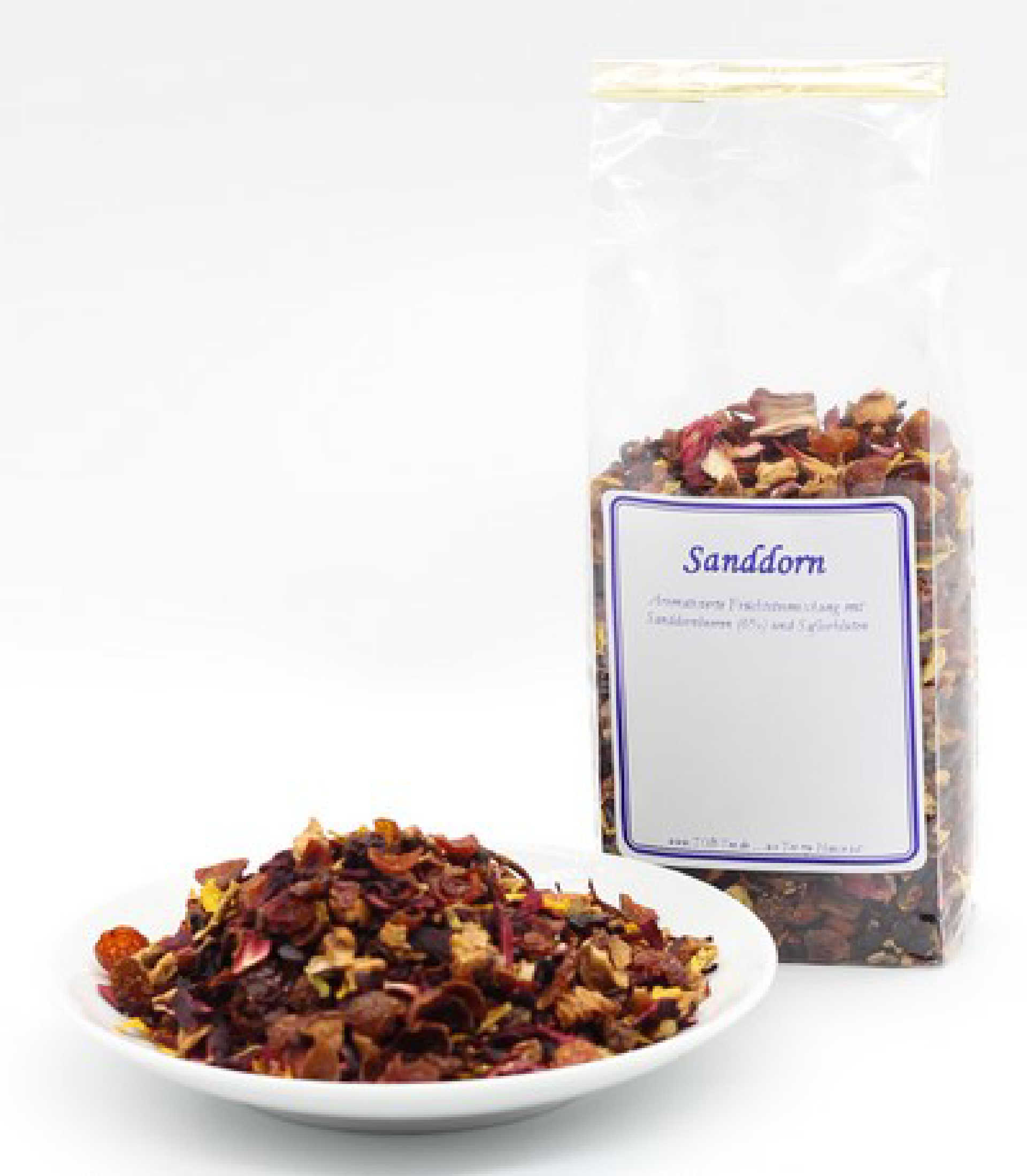 Aromatisierte Früchteteemischung (Hibiscus, Hagebutte und Apfel) mit Sanddornbeeren (6%) und Saflorblüten