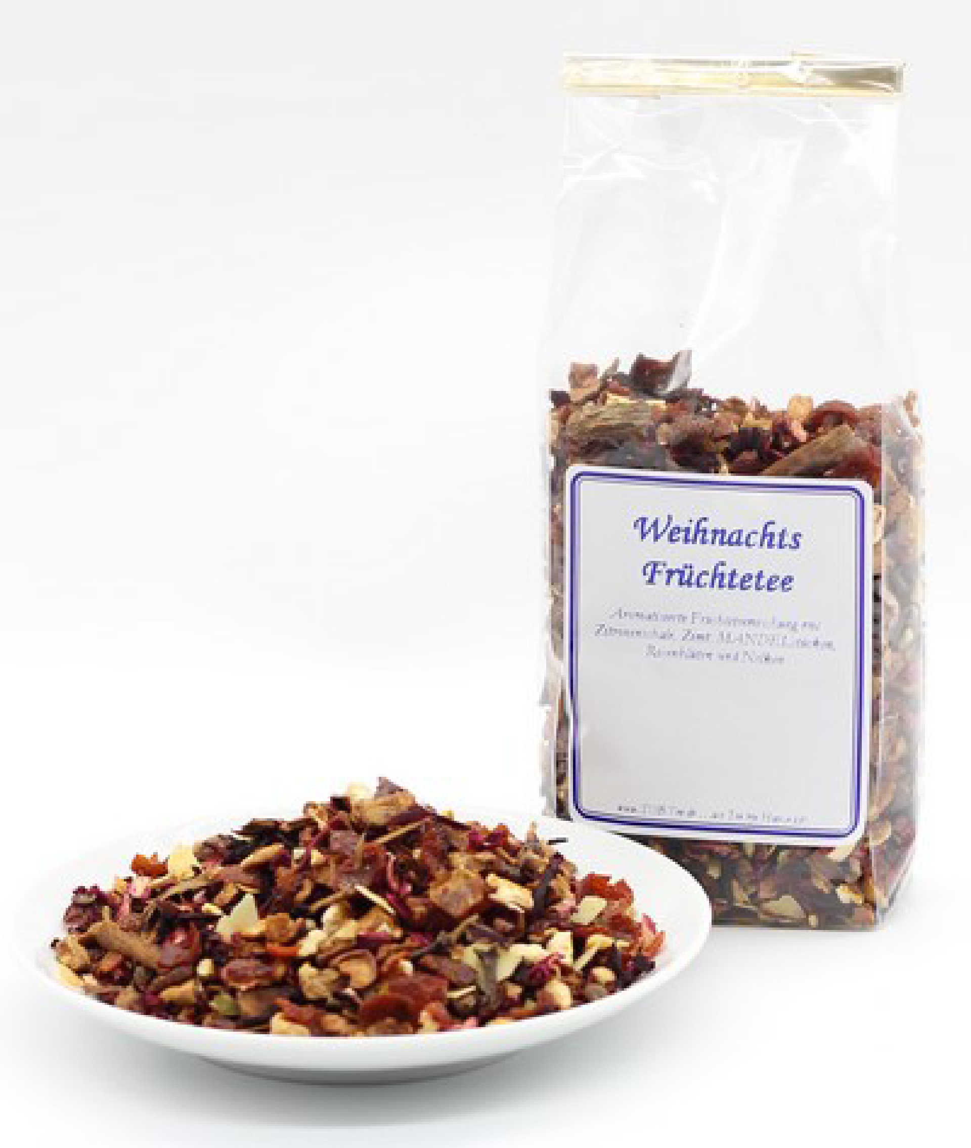 Aromatisierte Früchteteemischung (Hibiscus, Hagebutte und Apfel) mit Zitronenschale, Zimt, MANDELstücken, Rosenblüten und Nelken