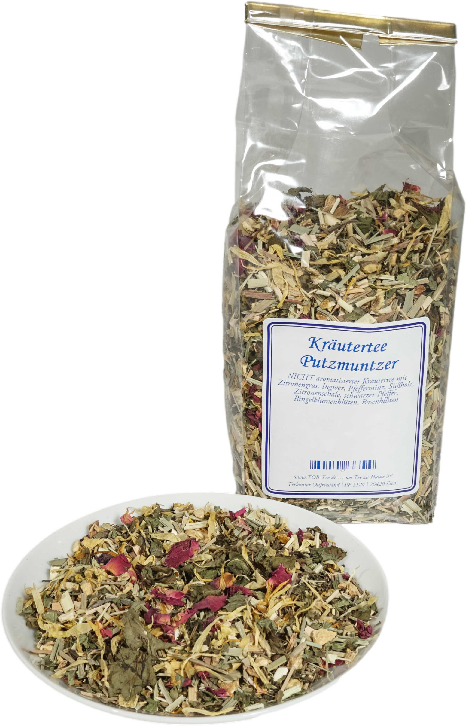 NICHT aromatisierter Kräutertee mit Zitronengras, Ingwer, Pfefferminz, Süßholz, Zitronenschale, schwarzer Pfeffer, Ringelblumenblüten, Rosenblüten