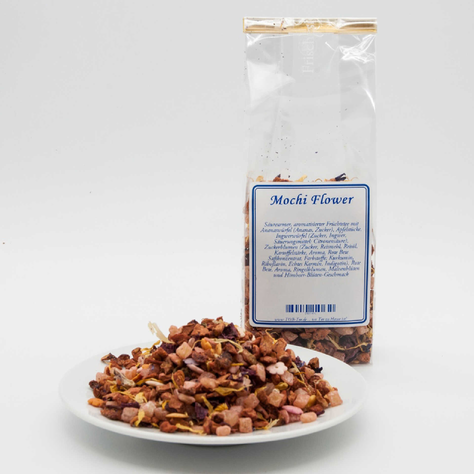 Säurearmer, aromatisierter Früchtetee mit Ananaswürfel, Apfelstücke, Ingwerwürfel, Zuckerblumen, Rote Bete, Aroma, Ringelblumen, Malvenblüten und Himbeer-Blüten-Geschmack.