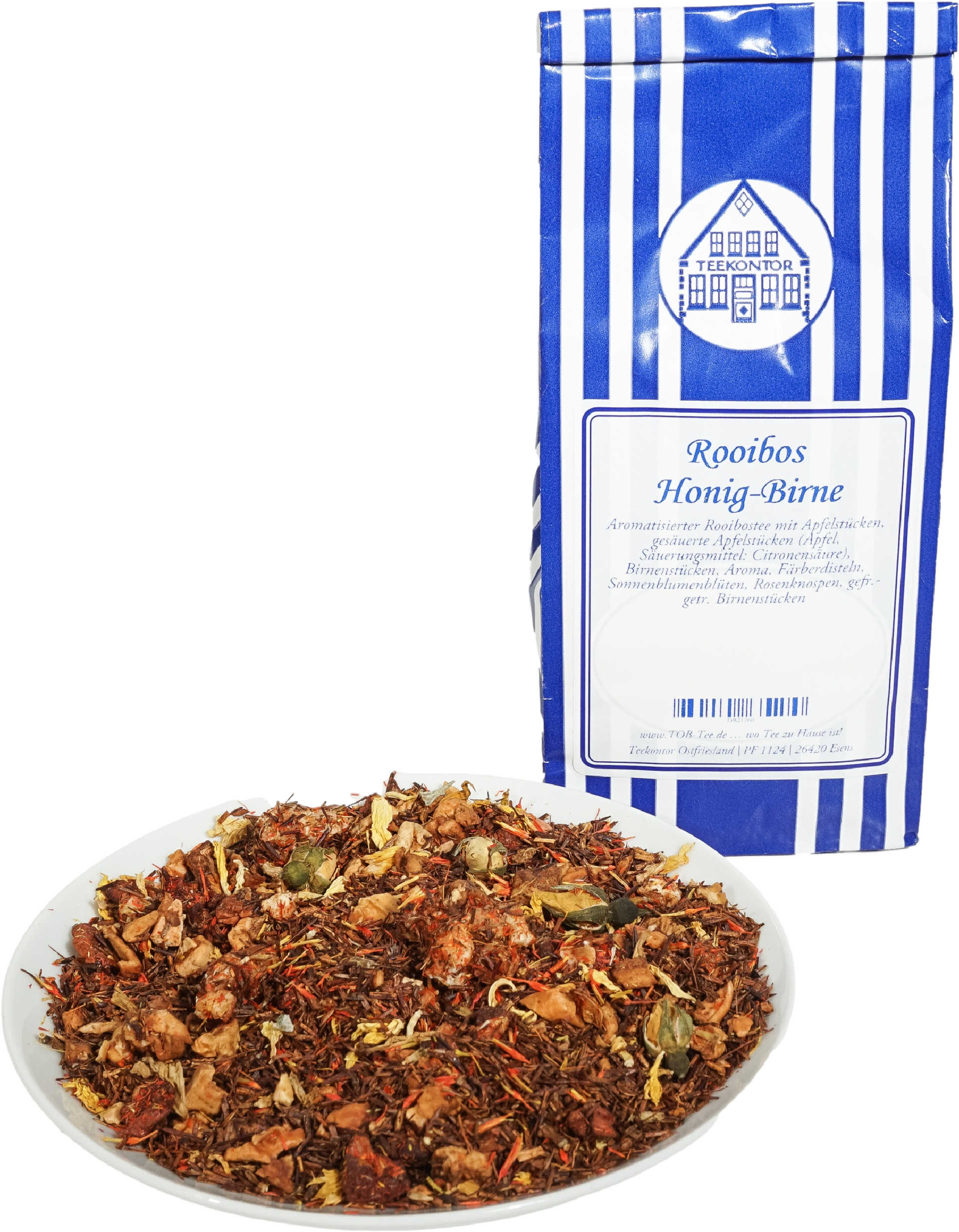 Diese besondere und leichte Komposition aus feinem Rotbuschtee, Apfel- und Birnenstücken ist optisch eine wahre Augenweide: Leuchtend-orangene Färberdisteln, edle gelbe Rosenknospen und Sonnenblumenblüten locken jedes Honigbienchen zum Naschen. Im Duft und Geschmack überzeugt eine stimmige Birnennote mit süß-cremigem Karamell und sanft vollmundige Honig-Noten. Entdecken Sie die köstliche Harmonie dieses Rotbuschtees, der Ihre Sinne mit einer perfekten Balance aus fruchtigen und süßen Aromen verwöhnt!