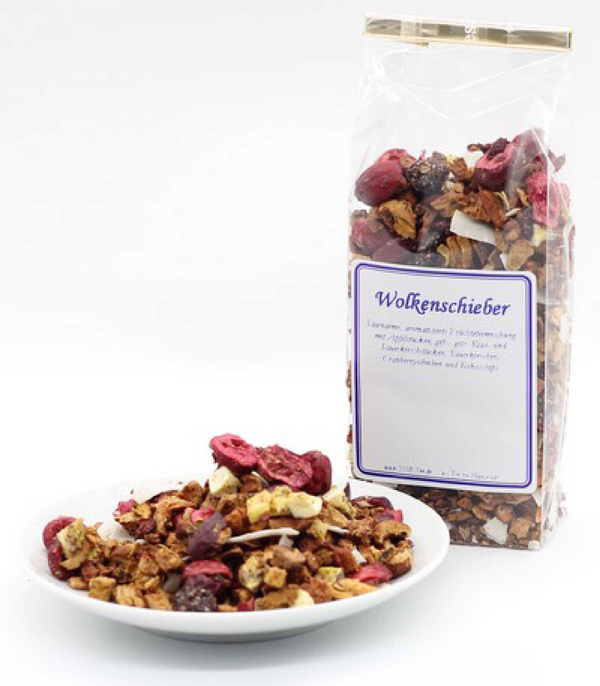 Säurearme, aromatisierte Früchteteemischung mit Apfelstücken, Kiwi- und Sauerkirschstücken, Cranberryscheiben und Kokoschips.