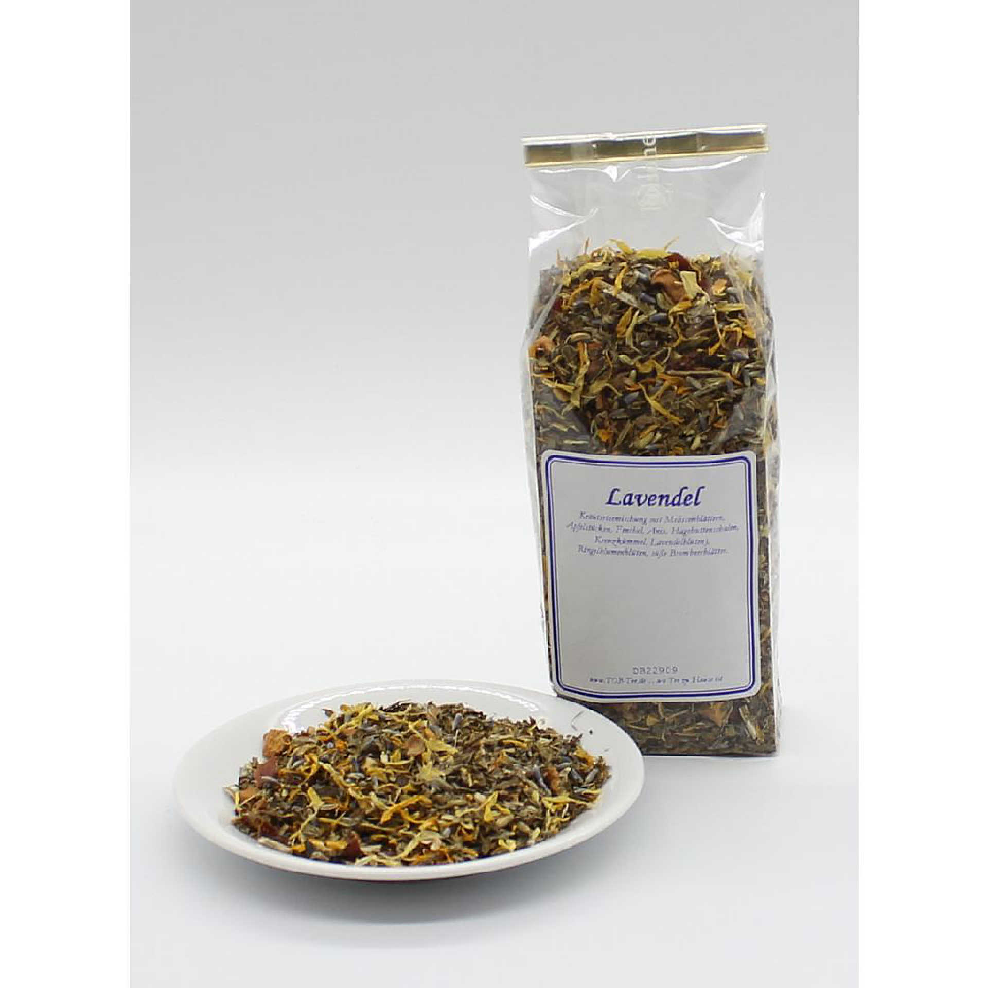 NICHT aromatisierte Kräuterteemischung mit Melissenblättern, Apfelstücken, Fenchel, Anis, Hagebuttenschalen, Kreuzkümmel, Lavendelblüten), Ringelblumenblüten, süße Brombeerblätter.